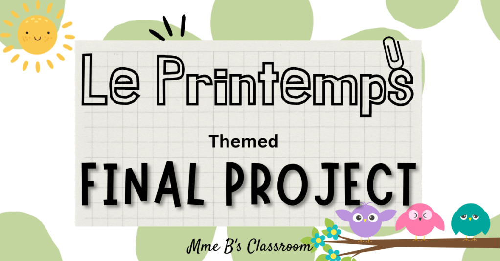I found presenting a project near the beginning of the unit, helps anchor the students into what we are learning this month. It’s no longer a vague concept of Le Printemps, but there is a tangible point to this unit. Beginning with the end in mind. In this case, we are creating a short story. So my entire unit is based about putting vocabulary words together to build a coherent sentence, expanding on the sentence and describing a picture. All are skills we will need to create a story board.