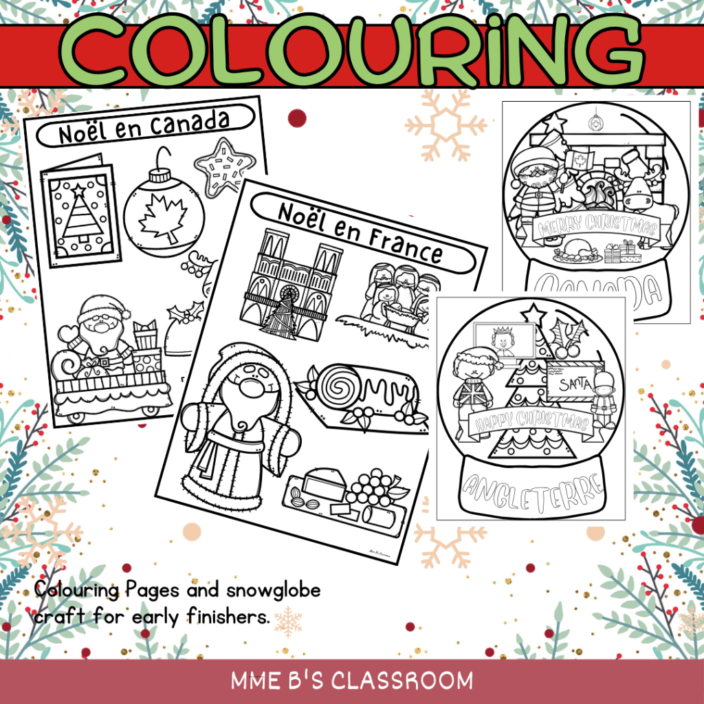 After our 5 days of activities, I will hand out another set of colouring sheets. These will be coloured during one period, then continued to work on during early Finisher or at home. Once coloured, they are cut them glued together to form a 3D snow globe of the various celebrations we just learned.